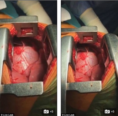 In the shocking video footage, the man's beating heart is seen exposed, as the surgeons