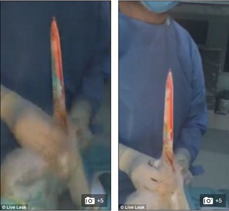 The graphic footage shows how surgeons opened up the man's chest to examine exactly where the sword had gone, and expertly guided it back out of his body.