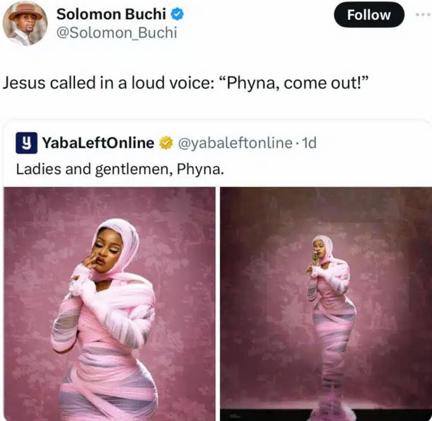 In response to Phyna’s bandage outfit, author Solomon Buchi wrote: “Phyna, come out!” Jesus yelled in a loud voice.
