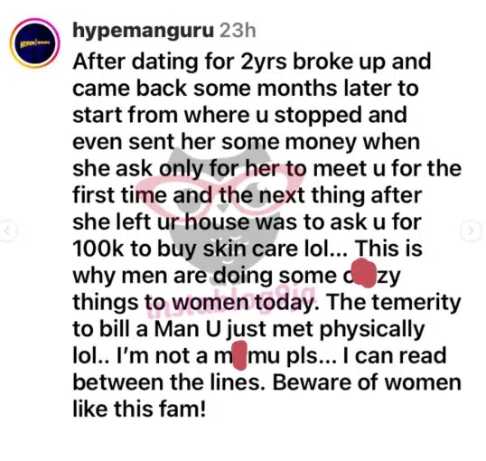 “After dating for 2yrs broke up and came back some months later to start from where u stopped and even sent her some money when she ask only for her to meet u for the first time and the next thing after she left ur house was to ask u for 100k to buy skin care 101… This is why men are doing some zy things to women today. The temerity to bill a Man U just met physically 101.. I’m not a mumu pls… I can read between the lines. Beware of women like this fam!”