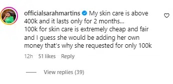 Reacting, Sarah stated that she herself spends over N400K for hers and it rarely lasts her up to 2 months.
