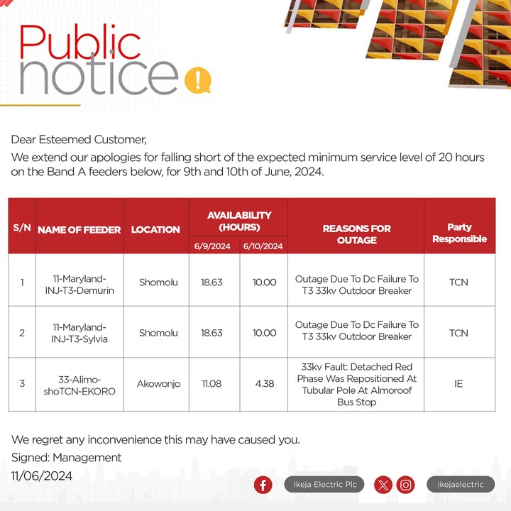 Ikeja Electricity Distribution Company has issued an apology to Band A customers.