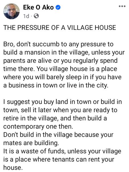 A UK-based Nigerian man, Eke Ako, has taken to Facebook to advise men not to build a mansion in the village unless their parents are still alive or they visit regularly.