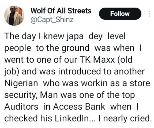 “The day I knew Japa dey level people to the ground was when I went to one of our TK Maxx (old job) and was introduced to another Nigerian who was working as a store security, Man was one of the top Auditors in Access Bank when I checked his LinkedIn... I nearly cried,” he wrote on Friday.