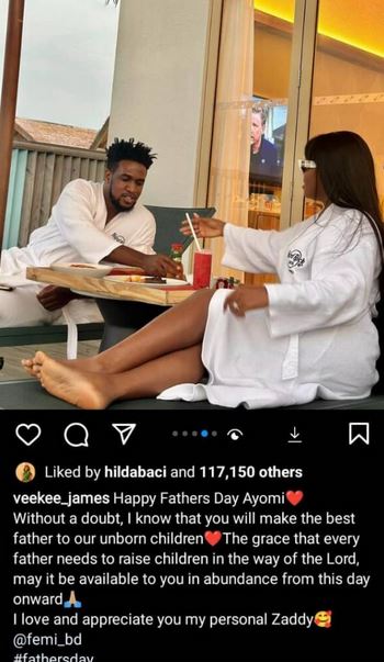 In her words: “Happy Fathers Day Ayomi❤️ Without a doubt, I know that you will make the best father to our unborn children❤️The grace that every father needs to raise children in the way of the Lord, may it be available to you in abundance from this day onward🙏🏼I love and appreciate you my personal Zaddy🥰 @femi_bd