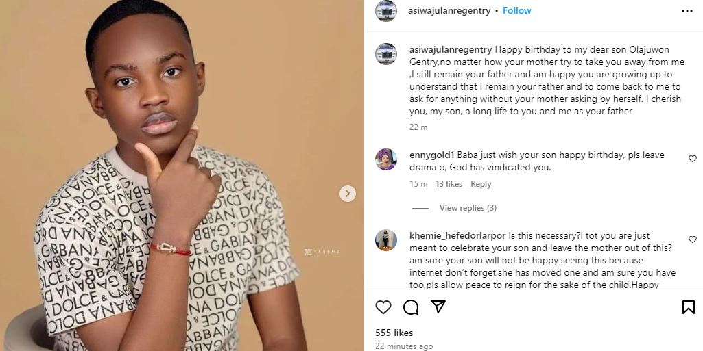 ‘’Happy birthday to my dear son Olajuwon Gentry, no matter how your mother try to take you away from me ,I still remain your father and am happy you are growing up to understand that I remain your father and to come back to me to ask for anything without your mother asking by herself. I cherish you, my son, a long life to you and me as your father'' he wrote