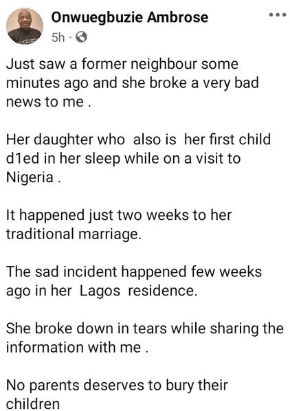 A Facebook user, Onwuegbuzie Ambrose, who disclosed this in a post on his page on Wednesday, June 19, said the lady died in her Lagos residence.
