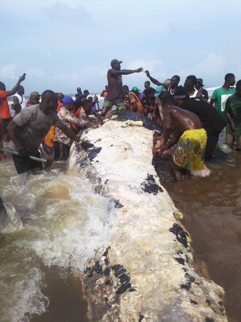 Five years ago, in August 2019, a giant whale was stranded in the same seaside community and was butchered by the residents for food.