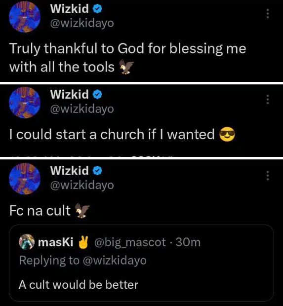 When a fan suggested he start a cult instead, Wizkid responded by saying that his fanbase, Wizkid FC is already a cult.