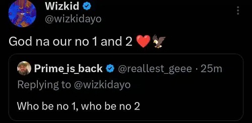 Wizkid replied: “God na our no 1 and 2 ❤️🦅 After God na God. No go whine 🦅”