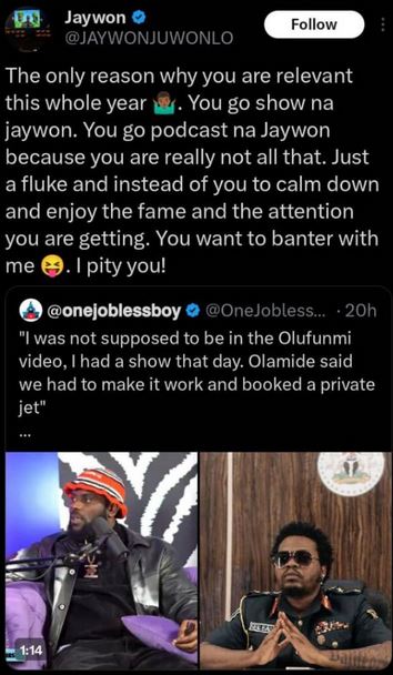 His words: “The only reason why you are relevant this whole year 🤷🏾♂️. You go show na jaywon. You go podcast na Jaywon because you are really not all that. Just a fluke and instead of you to calm down and enjoy the fame and the attention you are getting. You want to banter with me 😝. I pity you!