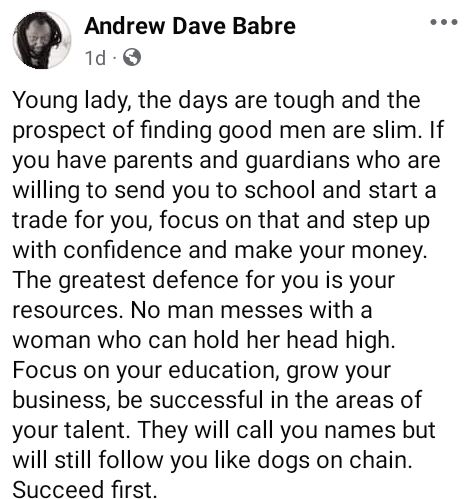 “Young lady, the days are tough and the prospect of finding good men are slim. If you have parents and guardians who are willing to send you to school and start a trade for you, focus on that and step up with confidence and make your money,” he wrote in a Facebook post on Thursday.