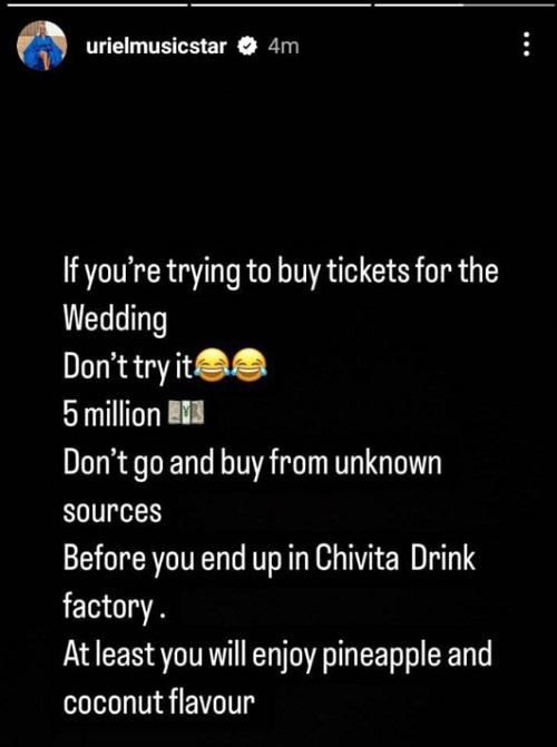 “If she’s Happy she’s happy. Not everyone has the same Deal breakers. Mine is just don’t use spoon to eat rice. If you’re trying to buy tickets for the Wedding, Don’t try it. 5 million. Don’t go and buy from unknown sources Before you end up in Chivita Drink factory. At least you will enjoy pineapple and coconut flavour”