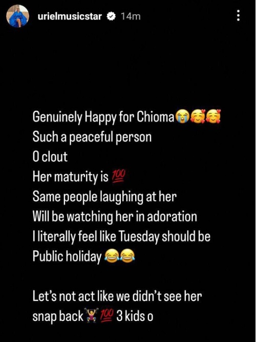 Uriel took to social media to voice her admiration for Chioma, praising her as a peaceful and mature individual who avoids unnecessary attention and drama.