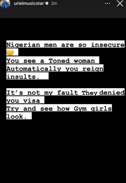 In a post shared on Instagram, Uriel said Nigerian men see women with toned bodies and automatically start reigning insults at them.