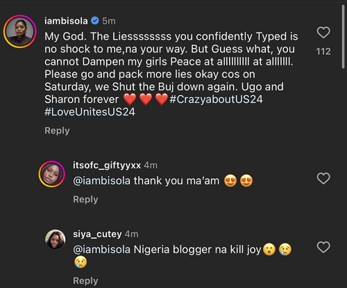 Reacting, Bisola who is Sharon’s best friend and Chief Bridesmaid quickly debunked the news in the comment section.