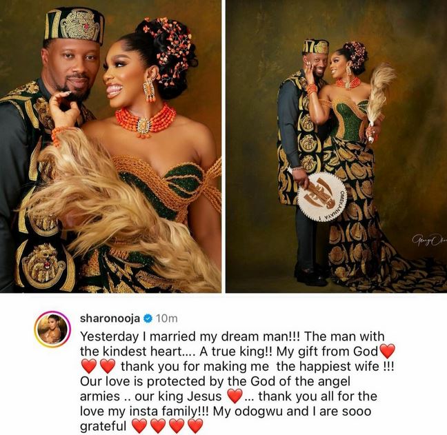 ‘’Yesterday I married my dream man!!! The man with the kindest heart…. A true king!! My gift from God thank you for making me the happiest wife !!! Our love is protected by the God of the angel armies .. our king Jesus… thank you all for the love my insta family!!! My odogwu and I are sooo grateful ‘’