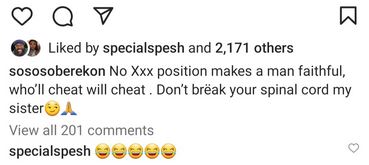 He wrote: "No Xxx position makes a man faithful. Who'll cheat will cheat. Don't break your spinal cord my sister."