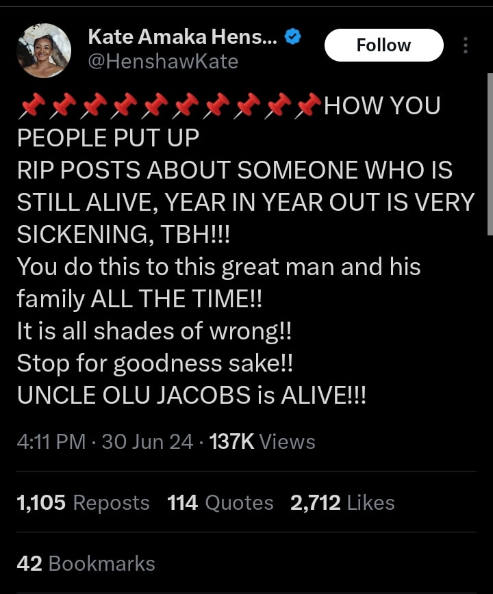 UNCLE OLU JACOBS is ALIVE!!!”.