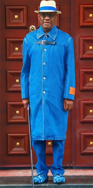 FCT Minister, Nyesom Wike has left tongues wagging after he donned a pricey Versace denim outfit.