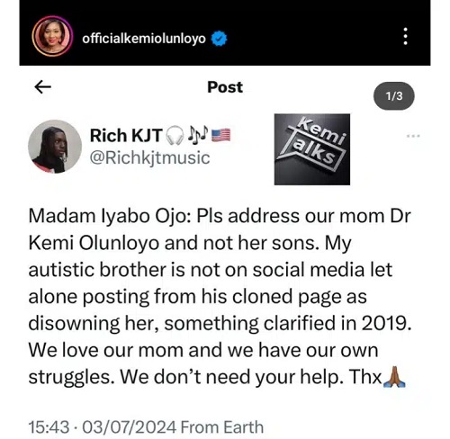 Madam Iyabo Ojo: Pls address our mom Dr Kemi Olunloyo and not her sons. My autistic brother is not on social media let alone posting from his cloned page as disowning her, something clarified in 2019. We love our mom and we have our own struggles. We don’t need your help. Thx.”he wrote.