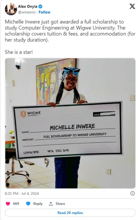 “Michelle Inwere just got awarded a full scholarship to study Computer Engineering at Wigwe University. The scholarship covers tuition & fees, and accommodation (for her study duration). She is a star!” Alex Onyia wrote.
