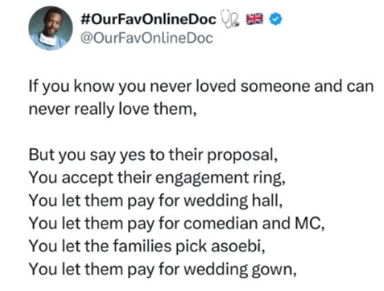 A popular Nigerian doctor, Olufunmilayo, has taken to the X platform to state that any woman who calls off her wedding days to the big days is wicked and narcissistic.