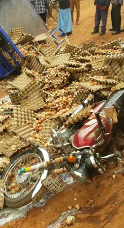 A business owner has suffered a major loss after a cargo tricycle conveying crates of eggs clashed with a motorcycle.