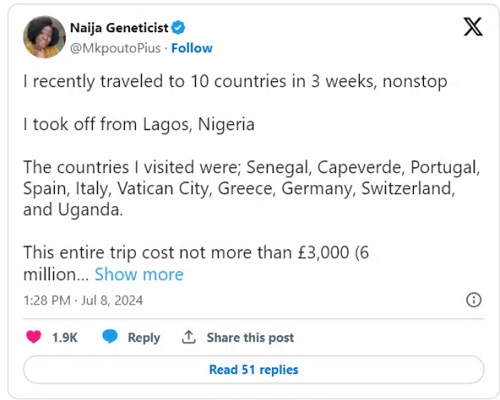 She revealed that she successfully embarked on a solo trip to 10 countries in just three weeks using a Nigerian passport.