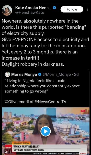 On July 9, 2024, Henshaw posted on X (formerly Twitter), saying: “Nowhere, absolutely nowhere in the world, is there this purported ‘banding’ of electricity supply. Give everyone access to electricity and let them pay fairly for their consumption. Yet, every 2 to 3 months, there is an increase in tariff!! Daylight robbery in darkness.”