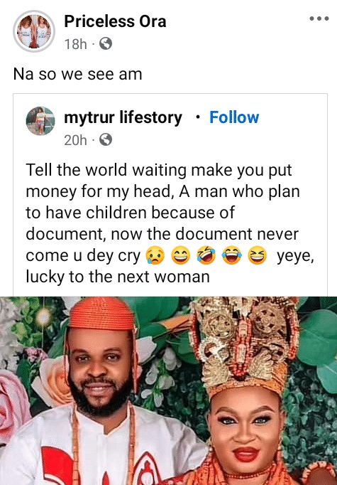 Reacting, his estranged wife, Priceless Ora took to her social media page to lambast him.