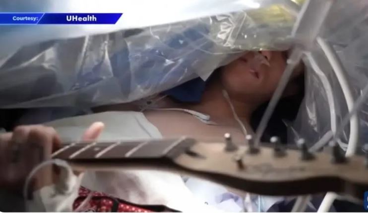 He was put to sleep initially as his skull was opened. Afterward, he was awakened during the tumor removal process to play his guitar.