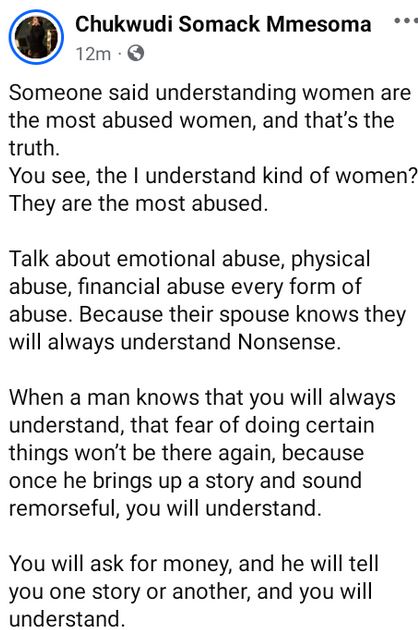 A Nigerian lady, Chukwudi Mmesoma, has taken to Facebook to opine that ‘understanding women' are the most abused.