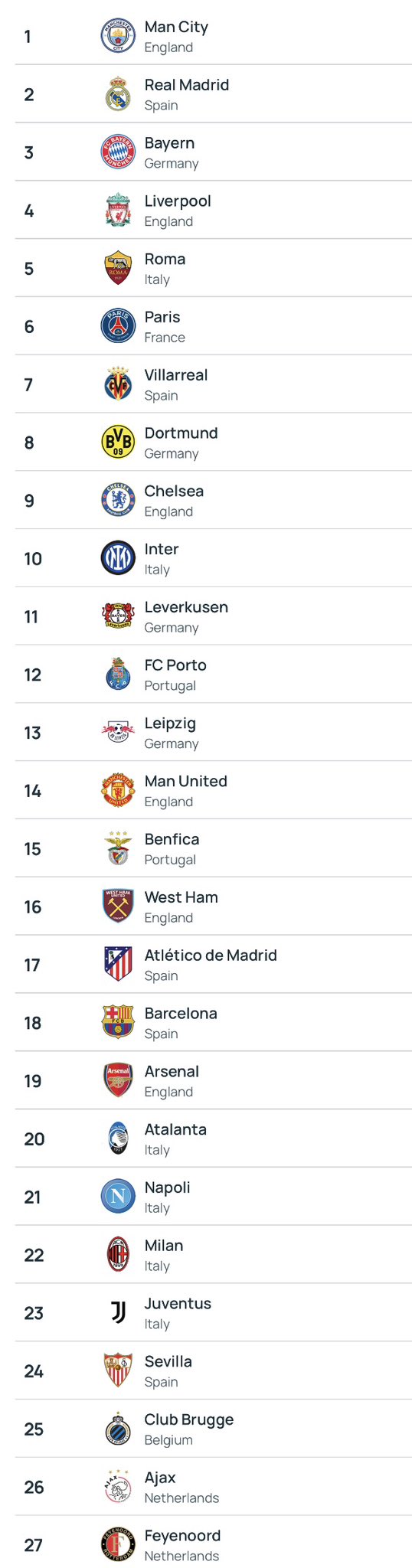 The next Premier League side to feature in the coefficient are Chelsea in ninth, followed by Manchester United in 14th, West Ham in 16th and Arsenal in 19th.