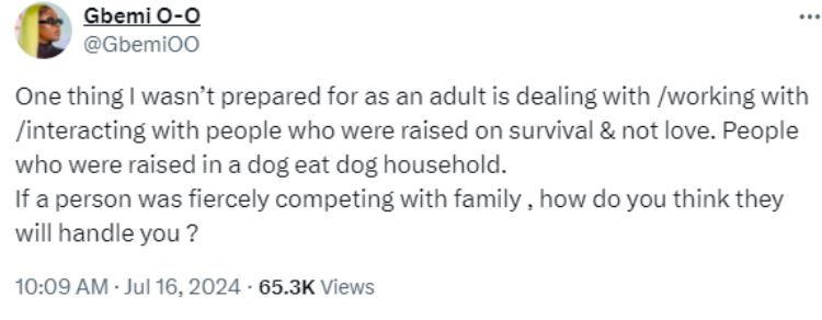 ''One thing I wasn’t prepared for as an adult is dealing with /working with /interacting with people who were raised on survival & not love. People who were raised in a dog eat dog household.