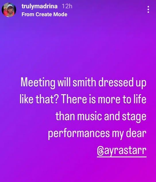 She wrote: “Meeting will smith dressed up like that? There is more to life than music and stage performances my dear @ayrastarr