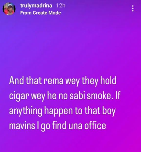 “And that Rema wey they hold cigar wey he no sabi smoke. If anything happen to that boy mavins I go find una office.”