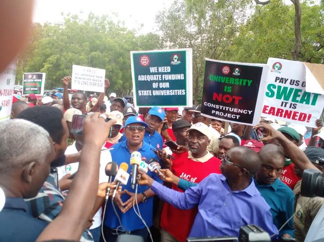 The protest is being led by the President of SSANU, Mohammed Aruna Ibrahim and General Secretary of NASU, Comrade Peters Adeyemi.