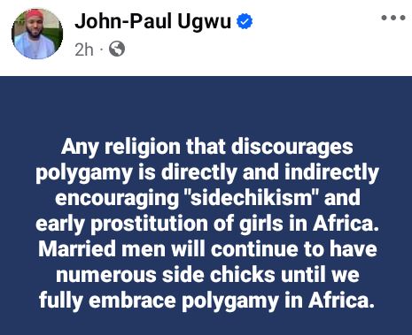 A Nigerian man, John Paul Ugwu, has opined that any religion that discourages polygamy is indirectly encouraging "sidechikism" and early pr0st!tution.