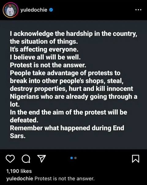“I acknowledge the hardships. Protest is not the answer. People take advantage of protests to break into other people’s shops, steal, destroy properties, hurt and kill innocent Nigerians who are already going through a lot. In the end, the aim of the protest will be defeated. Remember what happened during End Sars.”