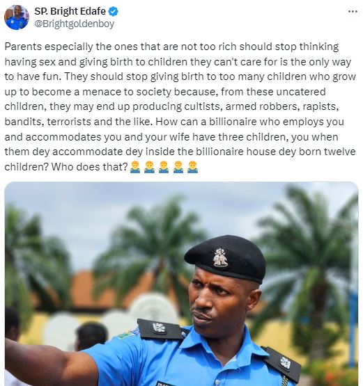 In a post shared on his X handle, Edafe opined that children born by parents who cannot cater for them usually grow to become a menace to the society.