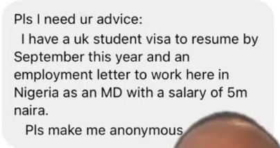“Pls I need your advice: “I have a UK student visa to resume by September this year and an employment letter to work here in Nigeria as an MD with a salary of 5m naira. Pls make me anonymous,” he quizzed.