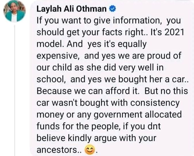 Layla Ali Othman, the wife of a member of the House of Representatives from Plateau State, Yusuf Gagdi, has fired back at those attacking her husband for gifting his daughter, Aisha, a brand new Sport Utility Vehicle after she graduated from secondary school.