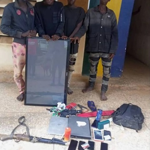 Among the recovered items were two laptops, eight mobile phones of various brands, a power bank, an MP3 player, three ATM cards, a Dane gun, a flat-screen television set, three flash drives, a cutlass, and a catapult.