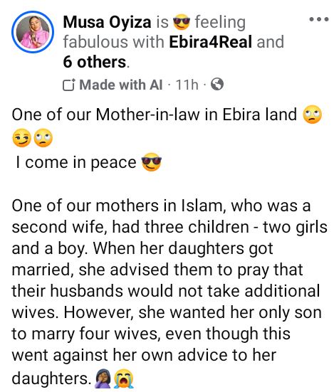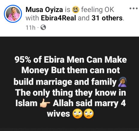 “95% of Ebira Men Can Make Money But them can not build marriage and family. The only thing they know in Islam is Allah said marry 4 wives,” she wrote in a Facebook post on Monday, July 22.