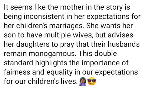 She also explained how a woman advised her daughter to pray against their husbands being polygamous while wanting her son to marry four wives.