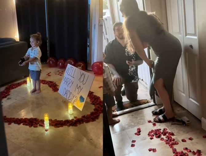 A video has captured the adorable moment a little girl assisted her father in proposing to her mother by holding a ring in a heart-shaped corner decorated with red petals.