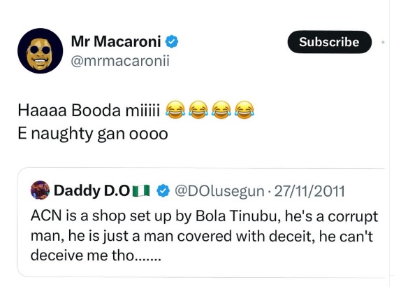 Reacting to the old tweets, Mr Macaroni described Olusegun Dada as a “naughty boy.”