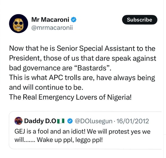Macaroni also dug up another tweet where Olusegun Dada called former President Goodluck Jonathan a “f00l and an Idi0t”.