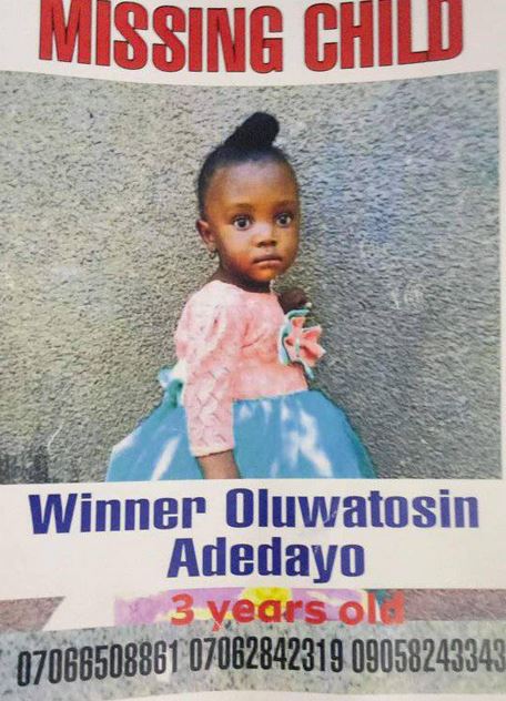 A 3-year-old girl, Winner Oluwatosin Adebayo, has been kidnapped by an unidentified woman in Zaria, Kaduna State.